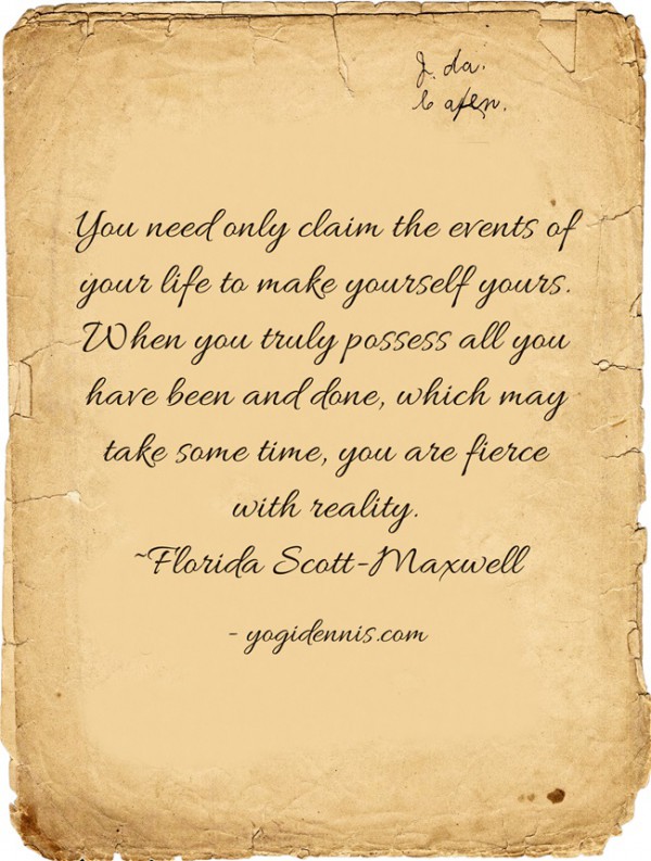 You need only claim the events of your life to make yourself yours. When you truly possess all you have been and done, which may take some time, you are fierce with reality. ~Florida Scott-Maxwell